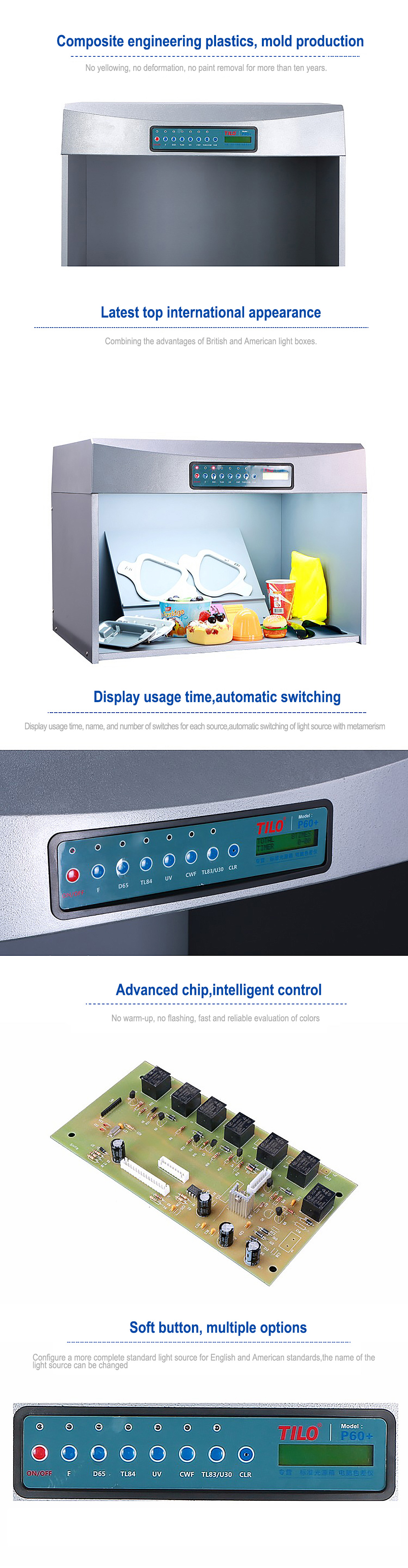 1. TILO Color light cabinets render color more accurately. With 6 different light sources(D65, TL84, CWF, TL83/U30, F, UV), which can detect the metamerism.